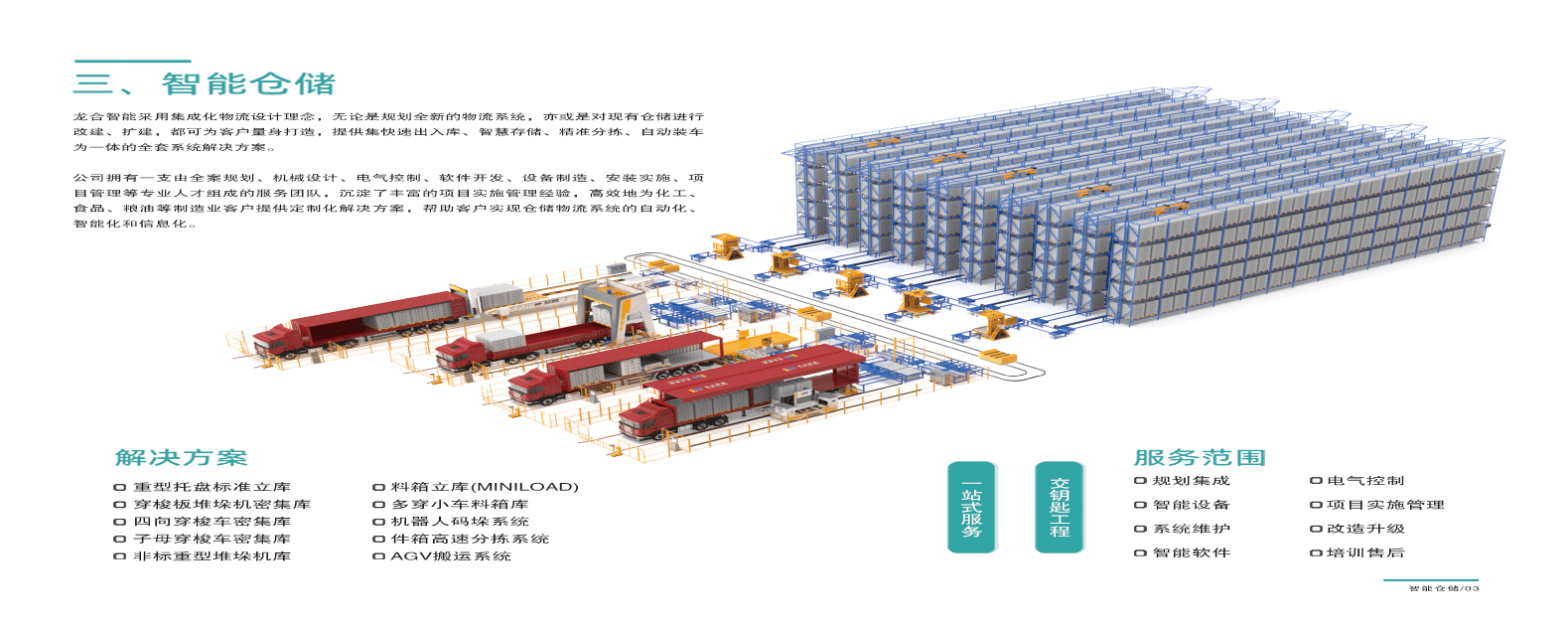 龍合智能裝備制造有限公司于2014年5月成立,位于閩西革命老區(qū)福建省龍巖高新區(qū)(經開區(qū)),系一家集自主研發(fā)、高端制造、營銷服務為一體的現(xiàn)代化智能制造企業(yè)。公司主營業(yè)務包括智能物流搬運、裝卸設備及其集成應用系統(tǒng)整體解決方案、智能倉儲軟硬件綜合集成系統(tǒng)及屬具產品等。